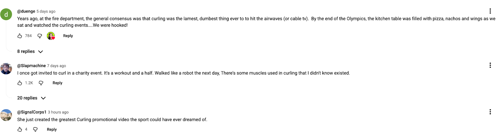 And her viewers eat it up. Take a gander at the video’s comments as proof. One viewer says, “I've never heard of this curling sport before. But after hearing all the fascinating strategies and physics behind it, I immediately got obsessed with it.”
